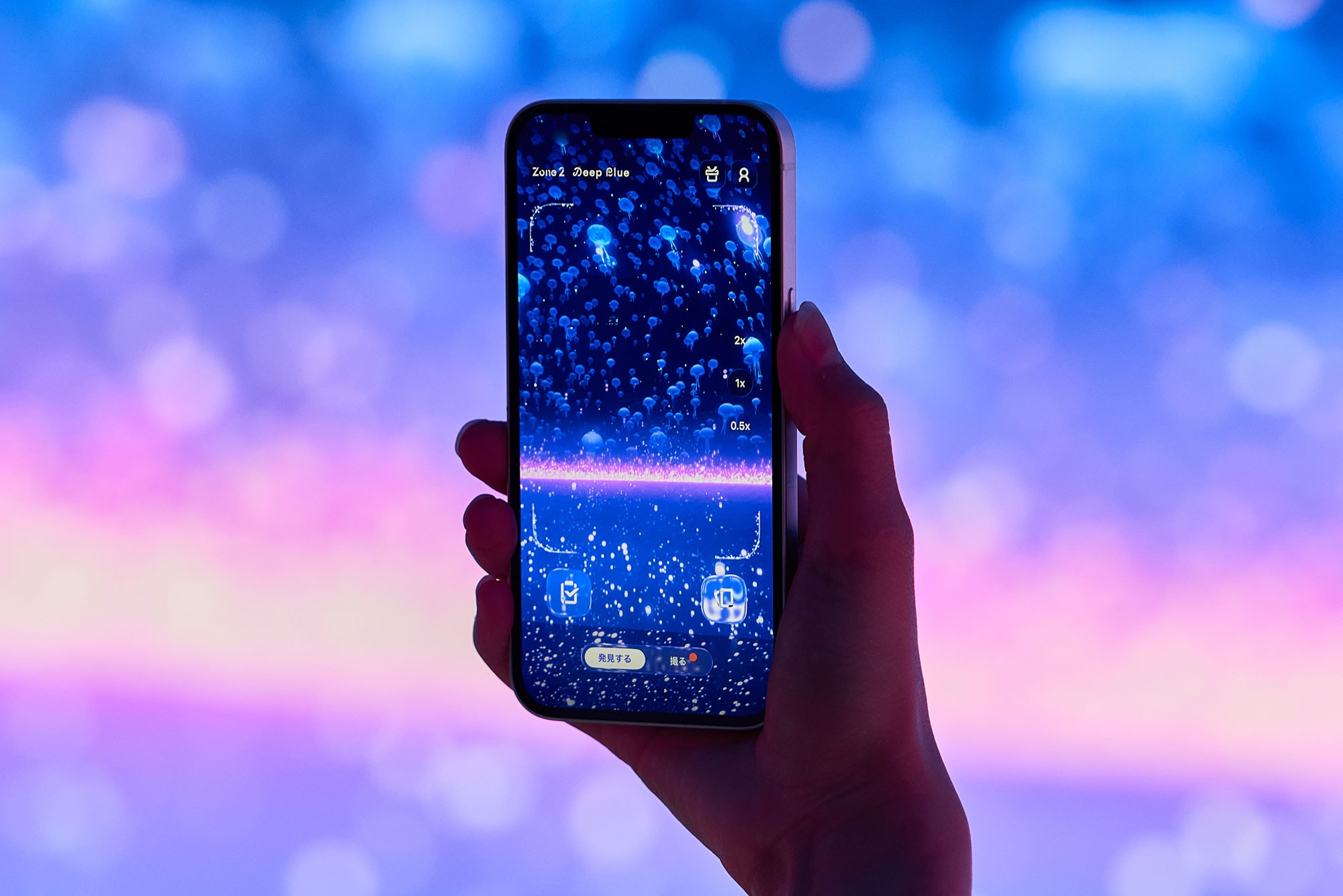 常設としては日本最大級の大きさとなる「LEDイマーシブトンネル(幅5m、奥行き8m、天井高4m)」を設置。頭上から足元までを包みこむようにつながる高精細な映像により、深海へ潜っていくような感覚を全身で体験することができます。今回発表したビジュアルでは、イワシのトルネードや浮遊するクラゲの中にダイブしていく瞬間を切り取りました。さらに、施設専用のスマートフォンアプリ「ワンダリアアプリ」を映像にかざすことで、生き物との遭遇も楽しむことができます。